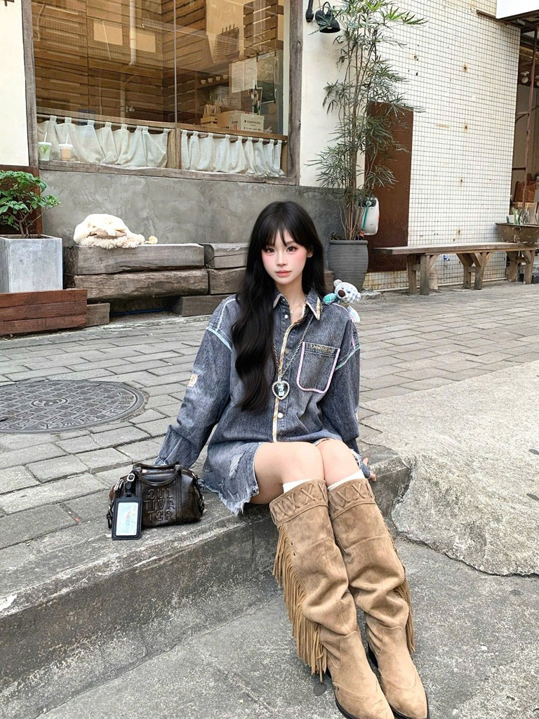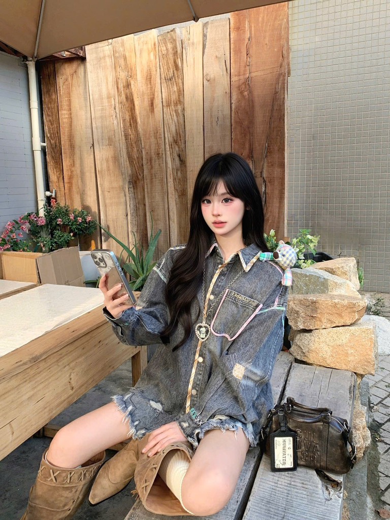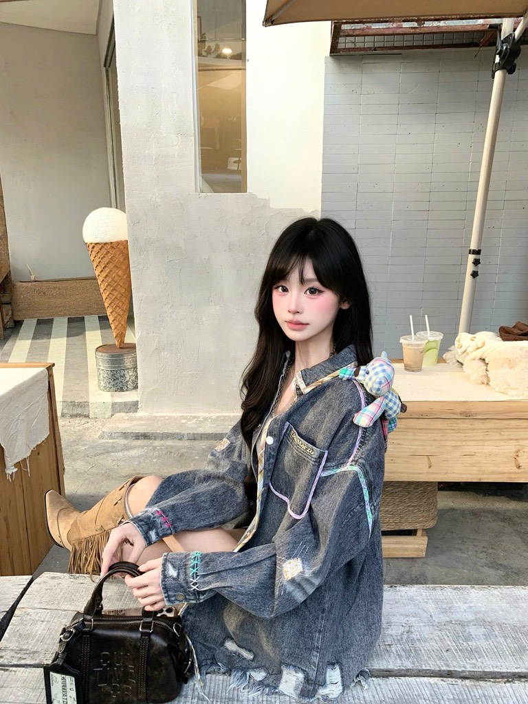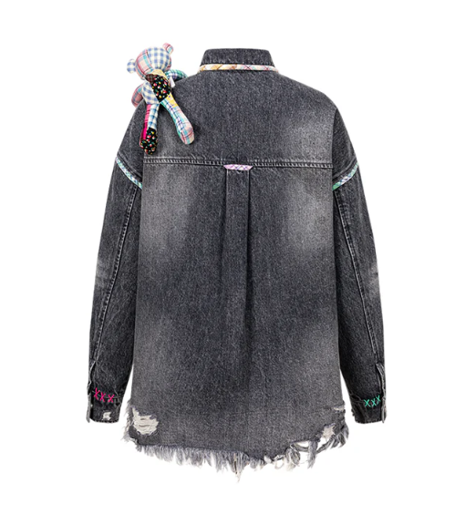13De Marzo Bear Plaid Line Denim Jacket