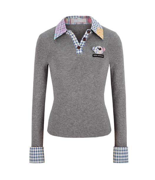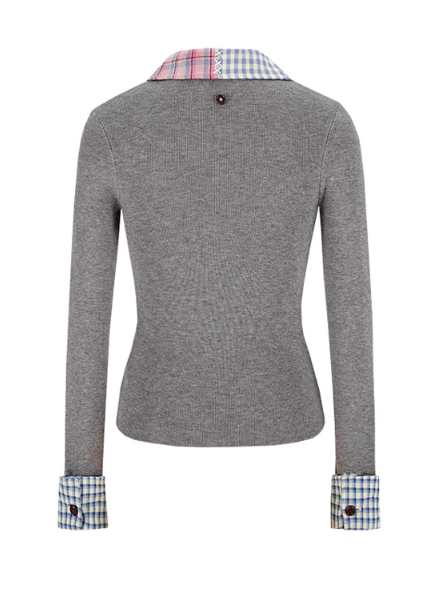 13De Marzo Plaid Cuff Knit Polo Top Grey